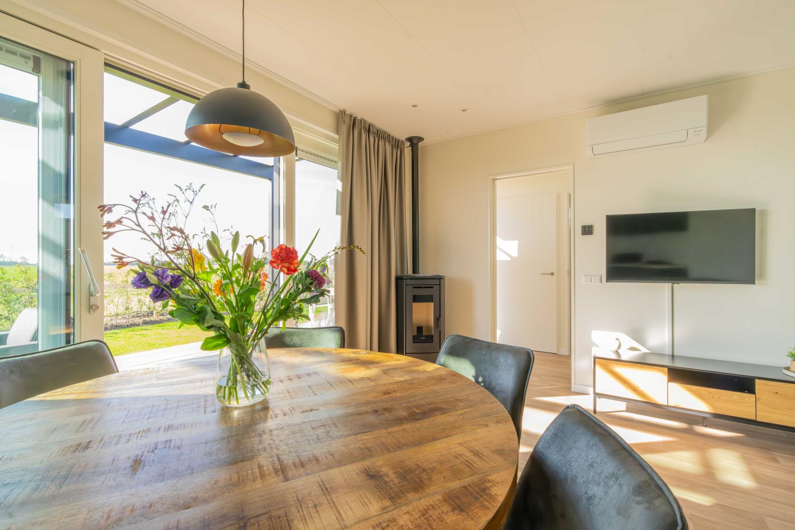 Das Chalet ist komplett elektrisch und das ganze Jahr über komfortabel dank der Klimaanlage (Heizen und Kühlen) und einem gemütlichen Pelletofen im Wohnzimmer für kühlere Tage. An der Rückseite des Chalets befindet sich ein Abstellraum mit Boiler, Modem, Waschmaschine und großzügigen Aufbewahrungsmöglichkeiten.