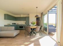 Die moderne, geräumige Küche ist mit Geschirrspüler, Kombi-Mikrowellen-Ofen, Induktionskochfeld mit Dunstabzugshaube und Kühlschrank mit Gefrierfach ausgestattet. Das Badezimmer verfügt über eine begehbare Dusche und ein großzügiges Waschbeckenmöbel.