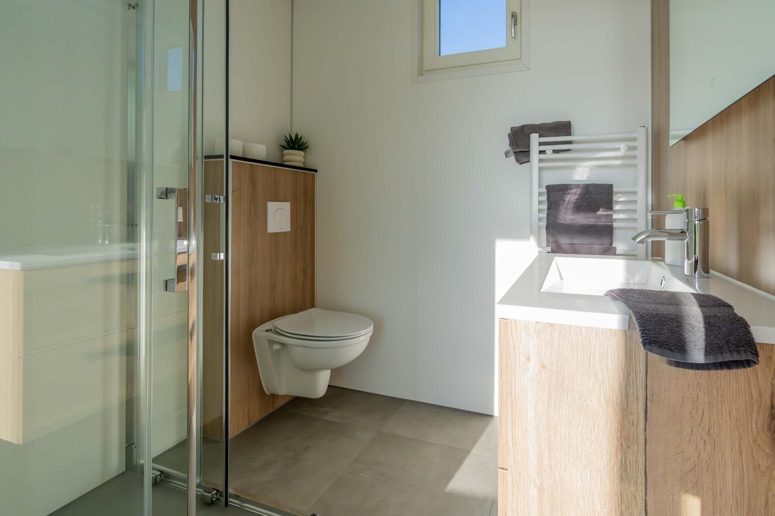 Dieses schöne Ferienhaus mit einer Fläche von 60 m² verfügt über 2 Schlafzimmer und ist für 4 Personen geeignet. Vom Flur aus haben Sie Zugang zu den Schlafzimmern (die jeweils über ein eigenes Badezimmer mit Dusche verfügen, eines davon hat auch eine eigene Toilette), einer separaten Toilette und dem geräumigen Wohnzimmer mit offener Küche. Diese moderne Küche ist mit einem Geschirrspüler, einer Kombi-Mikrowelle, einem Induktionskochfeld mit Dunstabzugshaube und einem Kühlschrank mit Gefrierfach ausgestattet.