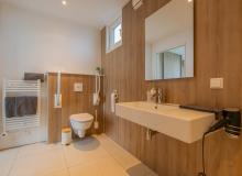 Dieses geräumige XL-Ferienhaus mit einer Fläche von 75 m² verfügt über 2 Schlafzimmer und ist speziell für Rollstuhlfahrer eingerichtet, damit diese sich problemlos fortbewegen können. Vom Flur aus haben Sie Zugang zu den Schlafzimmern, die jeweils über ein eigenes Badezimmer verfügen, sowie zu einer separaten Toilette und dem Abstellraum mit Waschmaschine. Auch das geräumige Wohnzimmer mit offener Küche ist vom Flur aus zugänglich.