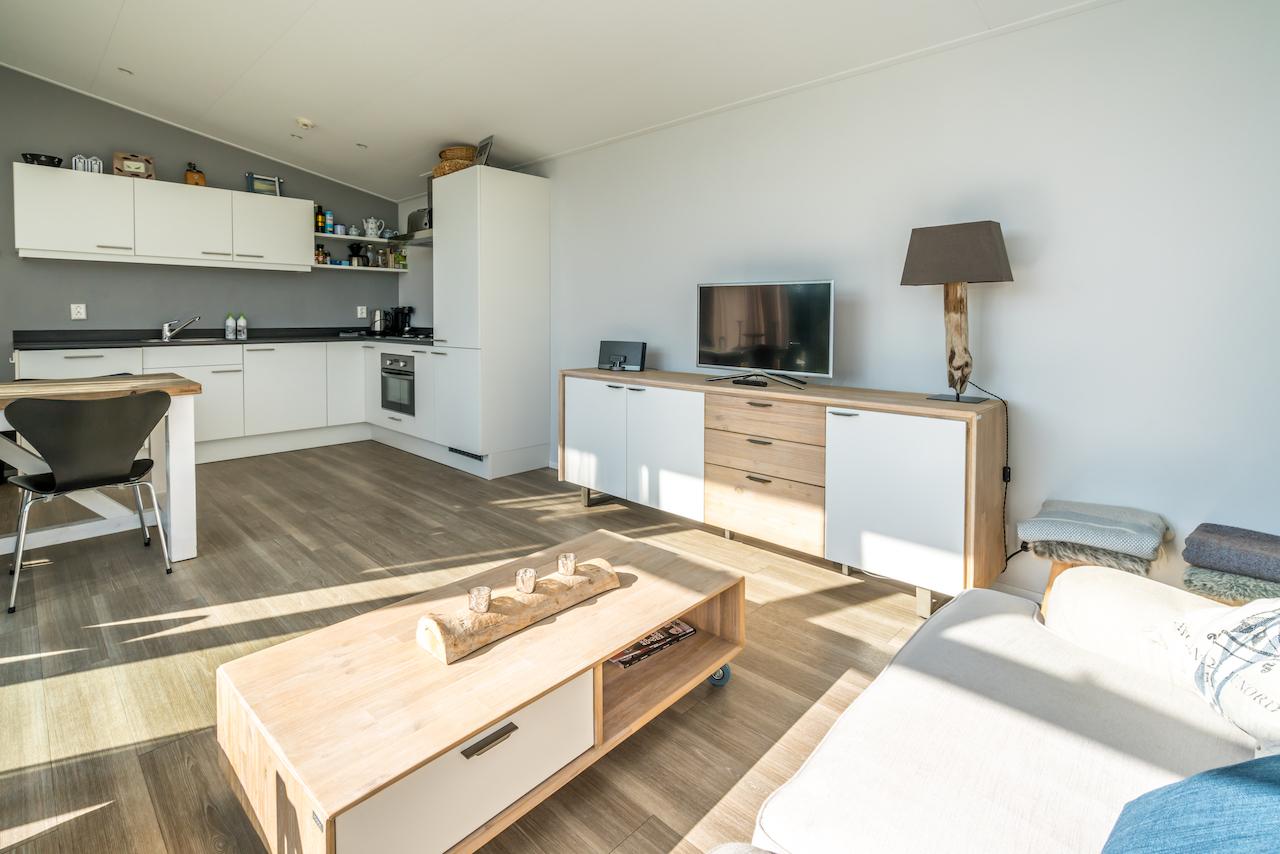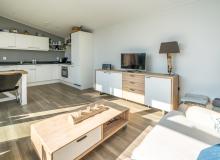 Die großen Fensterfronten bringen die Natur ins Wohnzimmer. Es gibt Flügeltüren zu einer großen Holzterrasse mit einem großen Esstisch. Die Küche ist komplett eingerichtet mit Kühlschrank, Gefrierfach, Geschirrspüler und Kombi-Mikrowelle. In der Küche steht eine Senseo Kaffeemaschine.