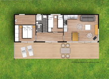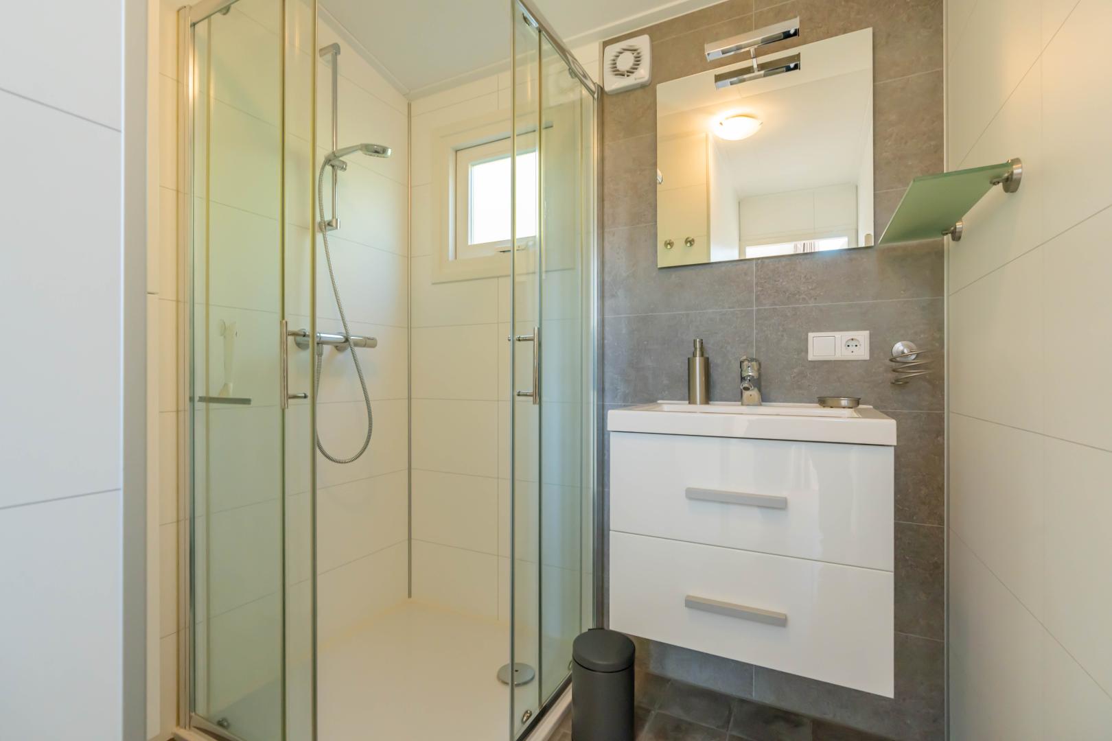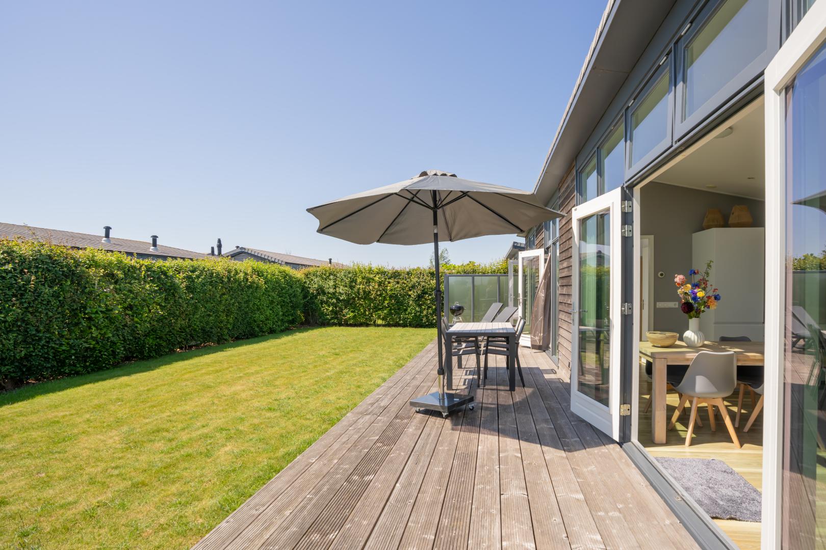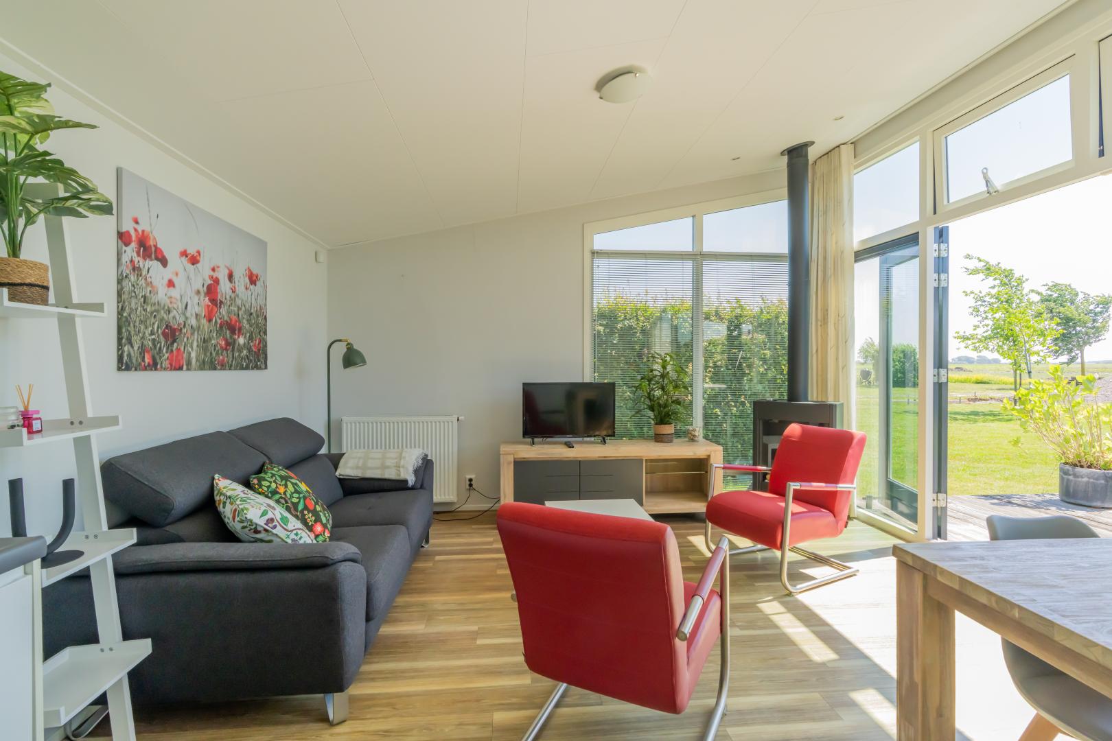 Die großen Fenster bringen die Natur ins Wohnzimmer und die Flügeltüren führen zu einer großen Holzterrasse. Die Küche ist komplett ausgestattet mit Geschirrspüler, Kombi-Ofen und Kühlschrank mit Gefrierfach. Im luxuriösen Badezimmer findest du eine geräumige Dusche mit Waschtisch. Es gibt ein separates WC. Die beiden Schlafzimmer sind mit Einbauschränken für ausreichend Stauraum ausgestattet. Natürlich ist dieses Buitenplaats mit Zentralheizung, Smart-TV und WLAN ausgestattet.