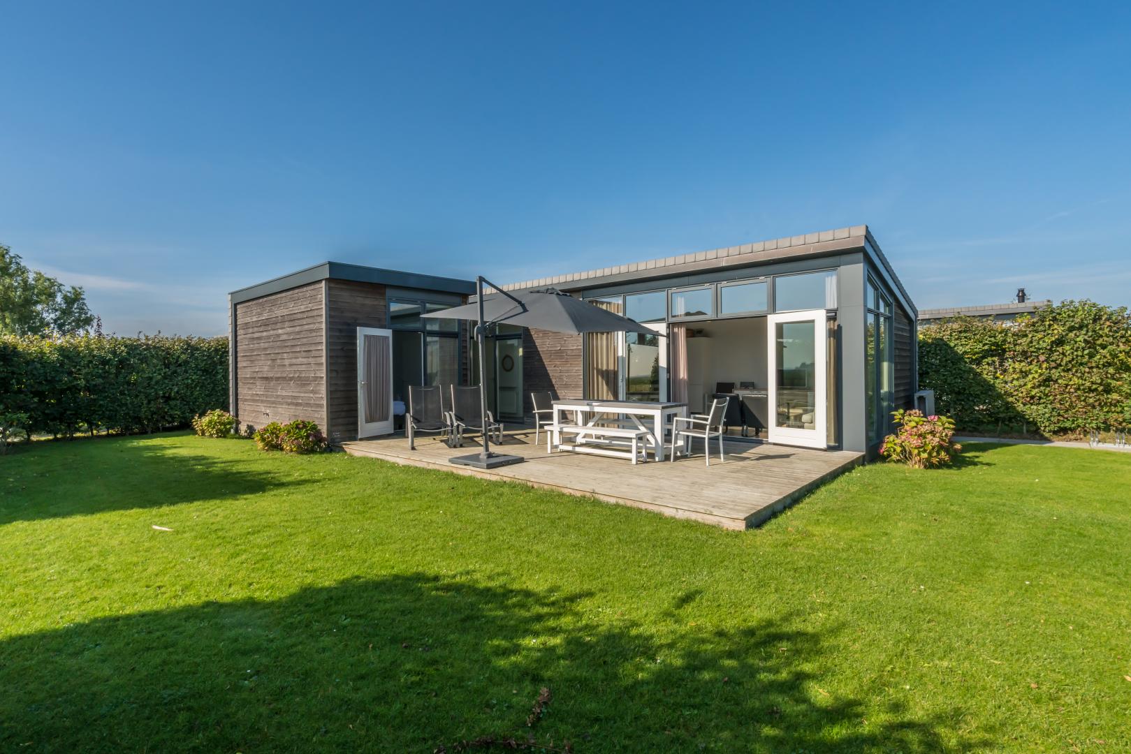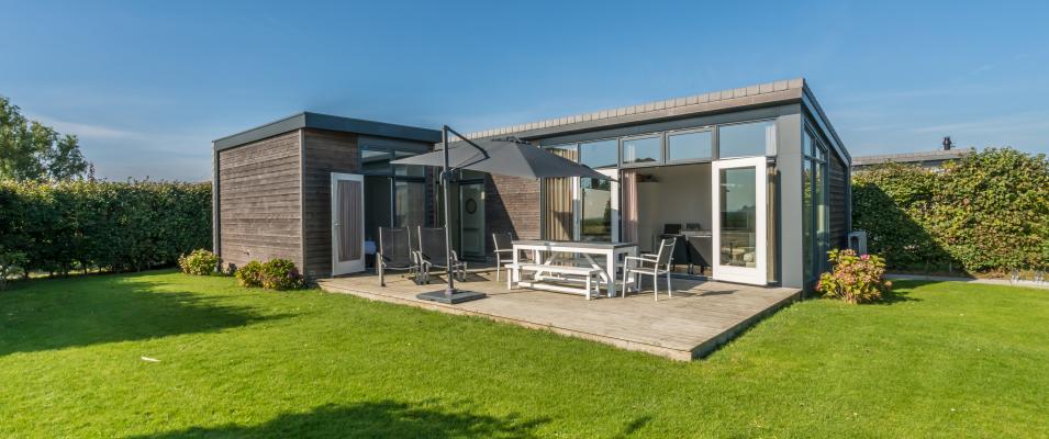 Ben je op zoek naar ruimte dan is Buitenplaats 15 een heerlijk vakantiehuis voor je. Dit mooie 7 persoons chalet van 75m2 groot is gebouwd in 2015. Het heeft een ruime hal met toegang tot 3 slaapkamers, de badkamer met toilet, de berging en de woonkamer met open keuken. De woonkamer heeft openslaande deuren naar het nieuwe, zuidelijk gelegen houten terras, waar je riant in de zon kunt zitten. De grote keuken is voorzien van een vaatwasser, combimagnetron, gaskookplaat met RVS afzuigkap, koelkast en vriezer. Er zijn 3 slaapkamers, waarvan 1 met eigen badkamer en toilet en 1 met een driepersoon stapelbed. De tweede badkamer in de hal heeft een inloopdouche met wastafelmeubel, en een apart toilet. Aan de achterzijde van het chalet vind je de berging (ook binnendoor bereikbaar) met CV ketel, modem, wasmachine en droger.