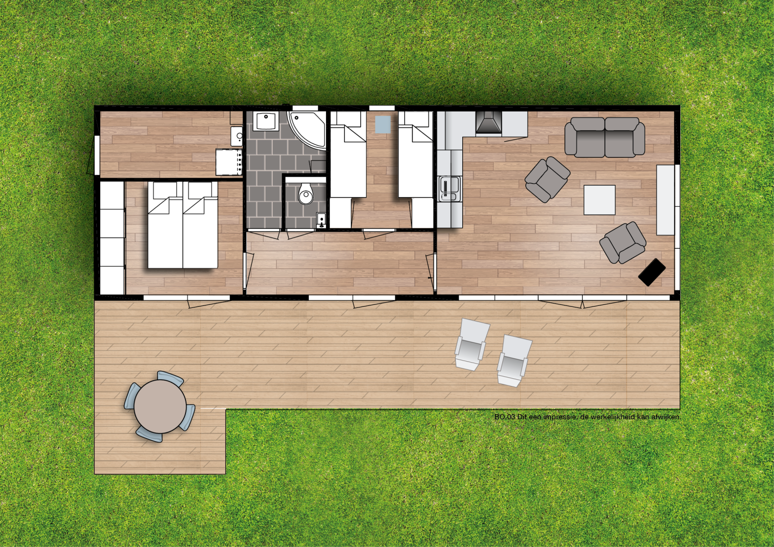 Dit leuke 4 persoons vakantiehuis is gezellig en luxe uitgevoerd. De grote raampartijen geven veel licht in de woonkamer en de openslaande deuren geven toegang tot een ruim aansluitend terras op het westen. Hier heb je een heerlijk plekje met veel privacy. In de woonkamer staat een gashaard en de keuken is compleet ingericht met vaatwasser, combimagnetron, senseo en koelkast met vriesvak. In de badkamer vind je een ruime douche met wastafelmeubel en designradiator. Er is een apart toilet en de twee slaapkamers hebben voldoende kastruimte voor je vakantiespullen. Uiteraard is het chalet uitgerust met CV, smart TV en wifi en in de berging staat een wasmachine.